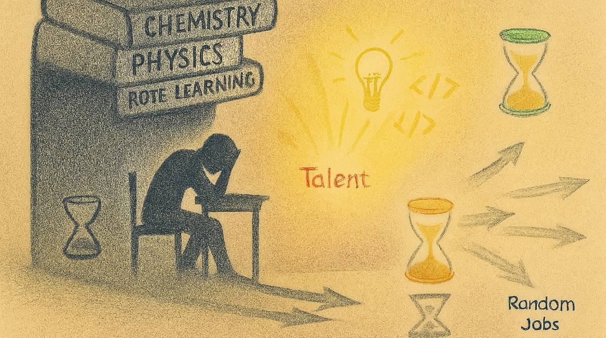 He highlights a fundamental flaw in the system: Aptitude and passion often take a backseat to the rote learning required for entrance tests.