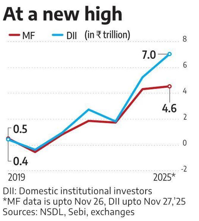 "MFs and domestic investors alike have been a major force in the market in recent years with the pace of financialisation of savings picking up in the post-Covid period," said Sriram BKR, senior investment strategist, Geojit Financial Services.