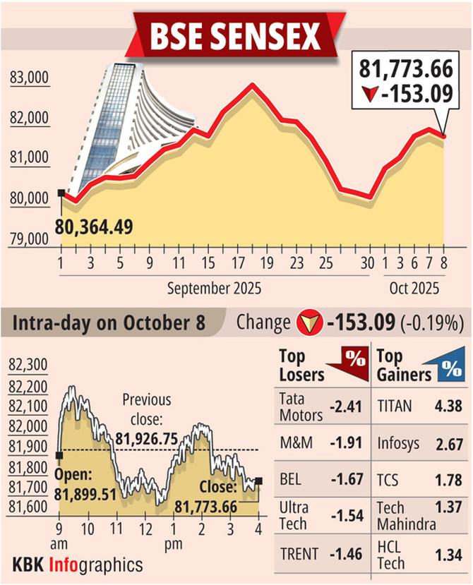 In a volatile session, the 30-share BSE Sensex declined 153.09 points or 0.19 per cent to settle at 81,773.66.