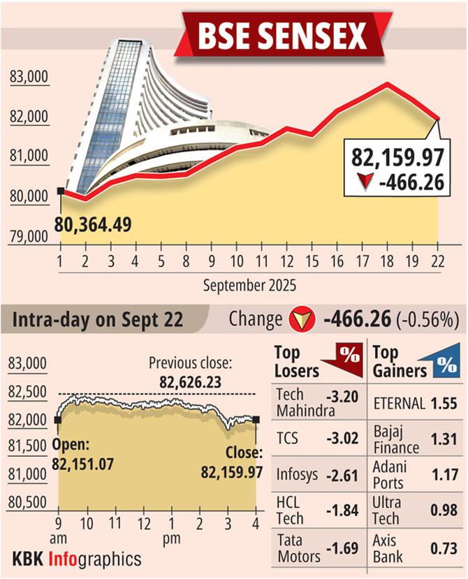 Benchmark equity indices Sensex and Nifty ended lower on Monday, dragged by IT stocks amid concerns over the US President Donald Trump's decision to raise H-1B visa fees to Rs 1,00,000 per worker.