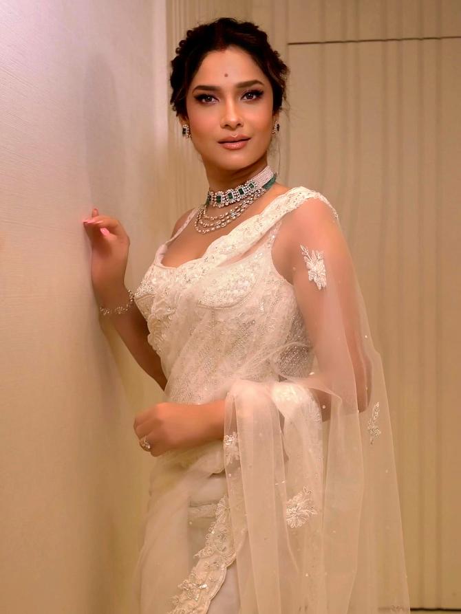 Ankita Lokhande continues to serve looks this festive season with her sheer white sari along with gorgeous diamond and emerald jewellery.