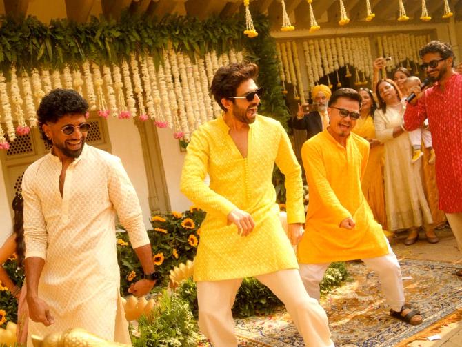 Kartik dances on Jeene Ke Hain Chaar Din from Mujhse Shaadi Karogi and Kajra Re from Bunty Aur Babli.