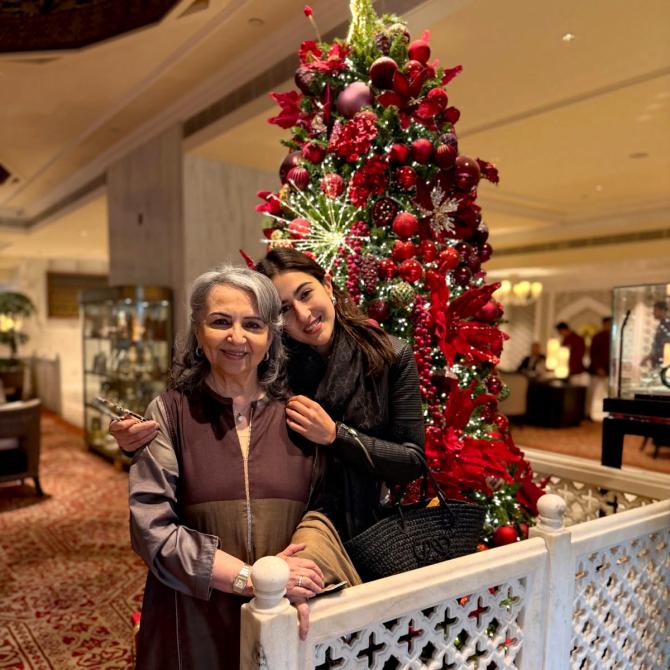 Sara and Sharmila click a picture against a beautiful Christmas tree.