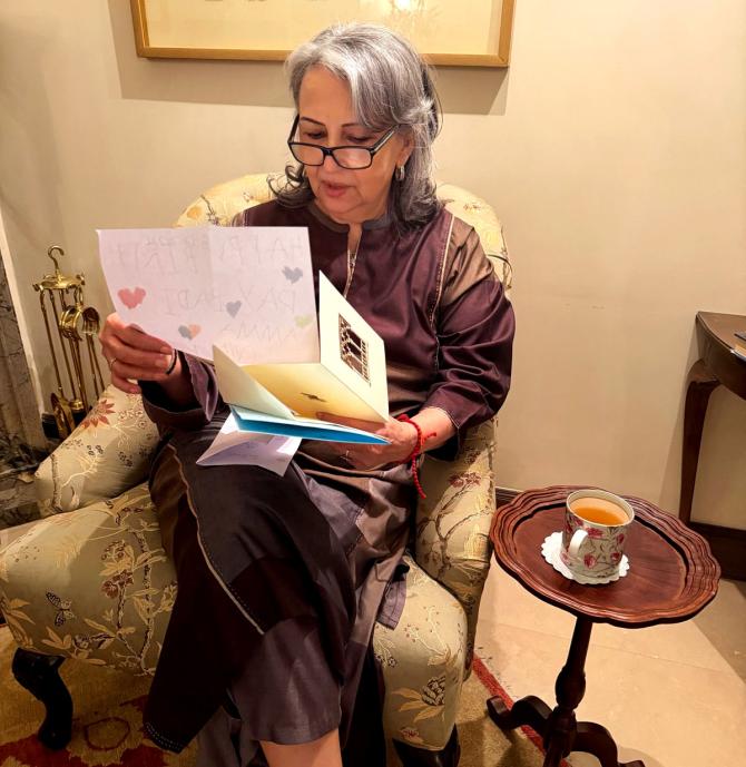 Sharmila reads a birthday card from one of her younger grandchildren.