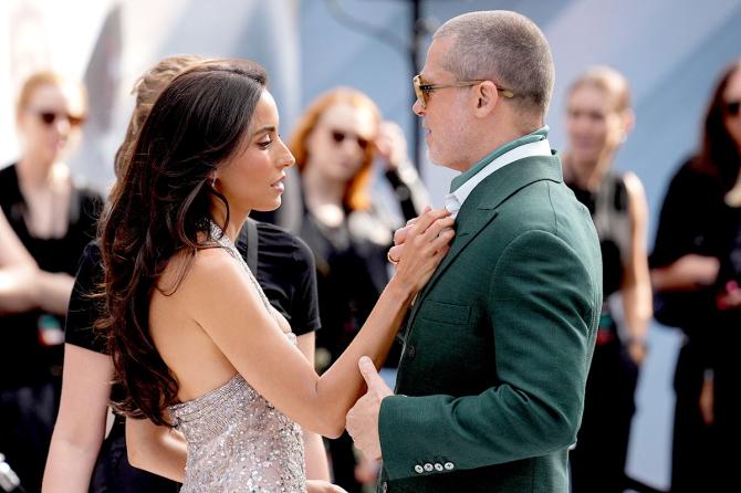 The paps land a cute shot of Ines adjusting Brad's outfit.