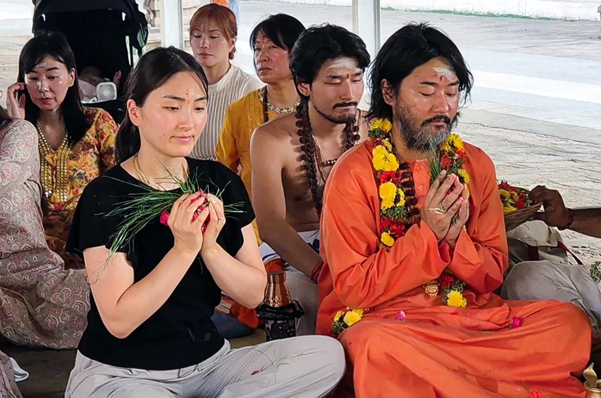 IMAGE: Japanese Hindu devotees conduct a special yagam for world peace at the Thiruvanaikoil Arulmigu Jambukeswarar temple in Tiruchirappalli. Photograph: ANI Video Grab