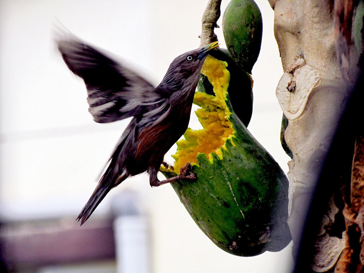 IMAGE: A chestnut-tailed starling feeds on a ripe papaya in Nadia, West Bengal. Photograph: ANI Photo