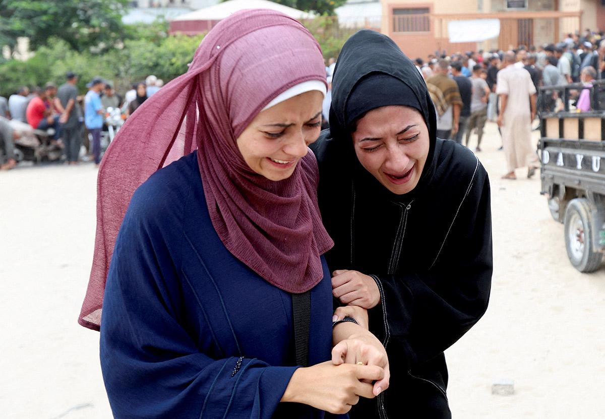 IMAGE: Mourners at the funeral of Palestinians who were killed by Israeli fire while trying to receive aid and who were killed in overnight Israeli airstrikes on tents in Khan Younis, southern Gaza Strip. Photograph: Ramadan Abed/Reuters