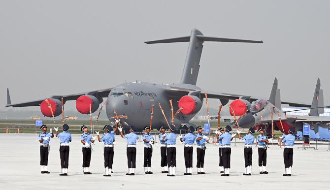 IMAGE: Air force personnel during the Air Force Day celebrations. Photograph: Jitender Gupta/ANI Photo