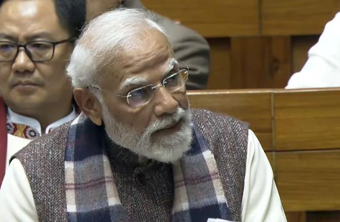 IMAGE: Prime Minister Narendra Modi initiates a discussion on 150 years of Vande Mataram in the Lok Sabha. Photograph: Sansad TV/YouTube