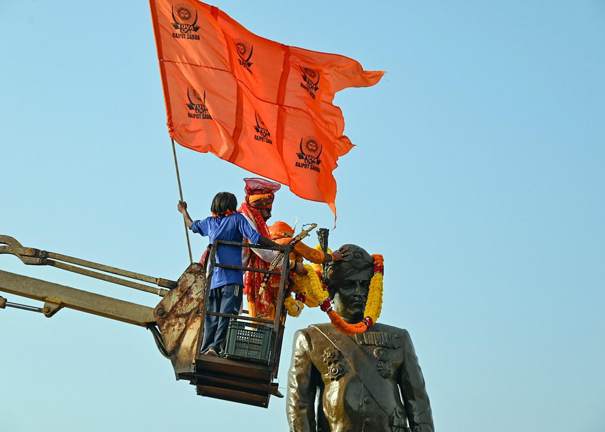 IMAGE: A member of the Yuva Rajput Sabha offers a garland to Maharaja Hari Singh's statue.