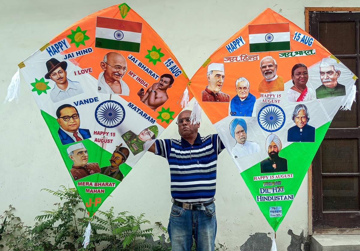 IMAGE: Kite maker Jagmohan Kanojia shows his newly made kites for Independence Day with pictures of Indian freedom fighters on them in Amritsar. Photograph: ANI Photo