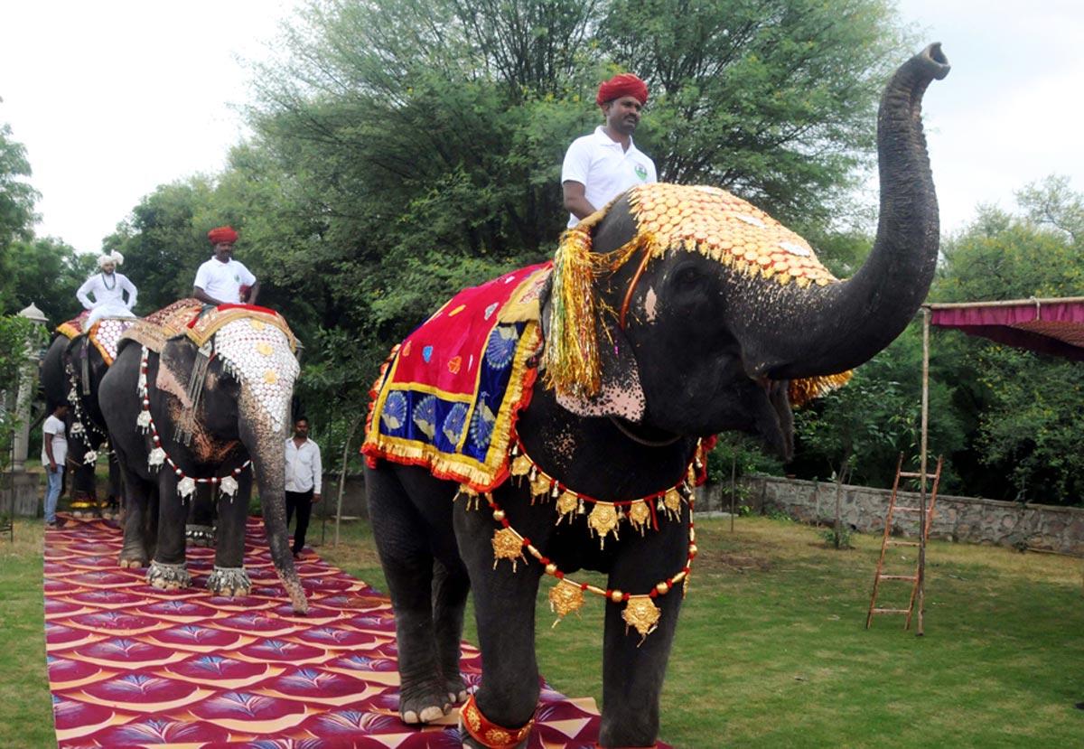 IMAGE: Elephants take part in an elephant fashion show on World Elephant Day in Jaipur. Photograph: ANI Photo