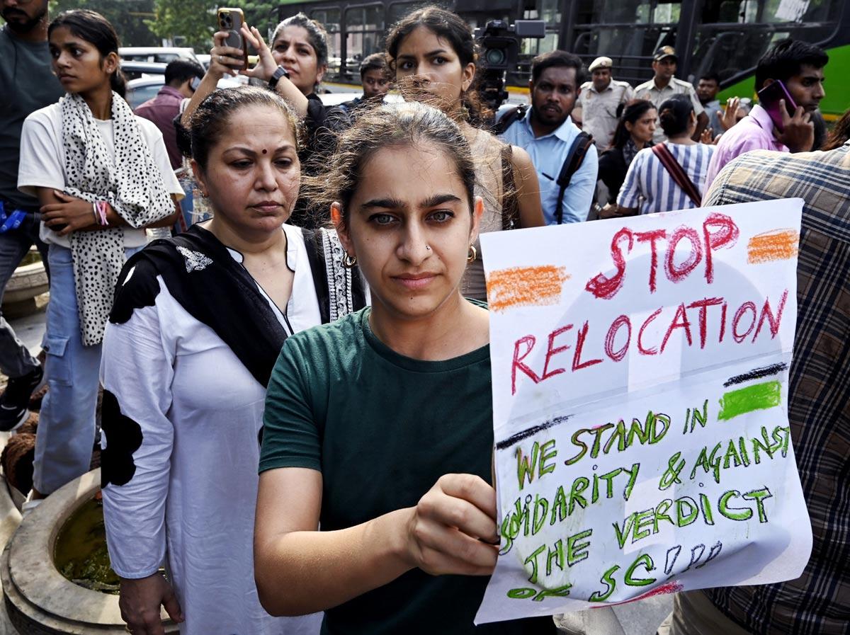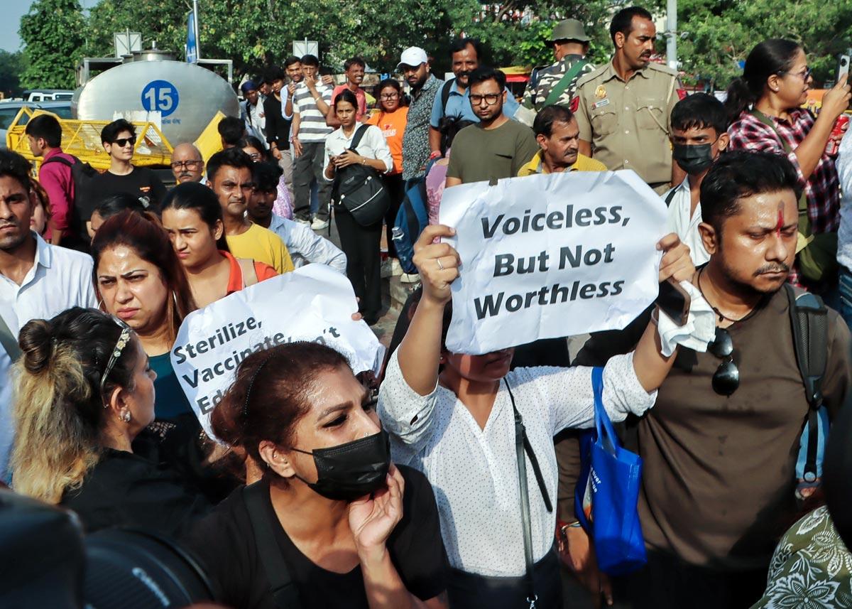 IMAGE: Dog lovers protest the Supreme Court's order to send all stray dogs in Delhi-NCR to shelters within 8 weeks at Connaught Place in New Delhi, here and below. Photograph: ANI Photo
