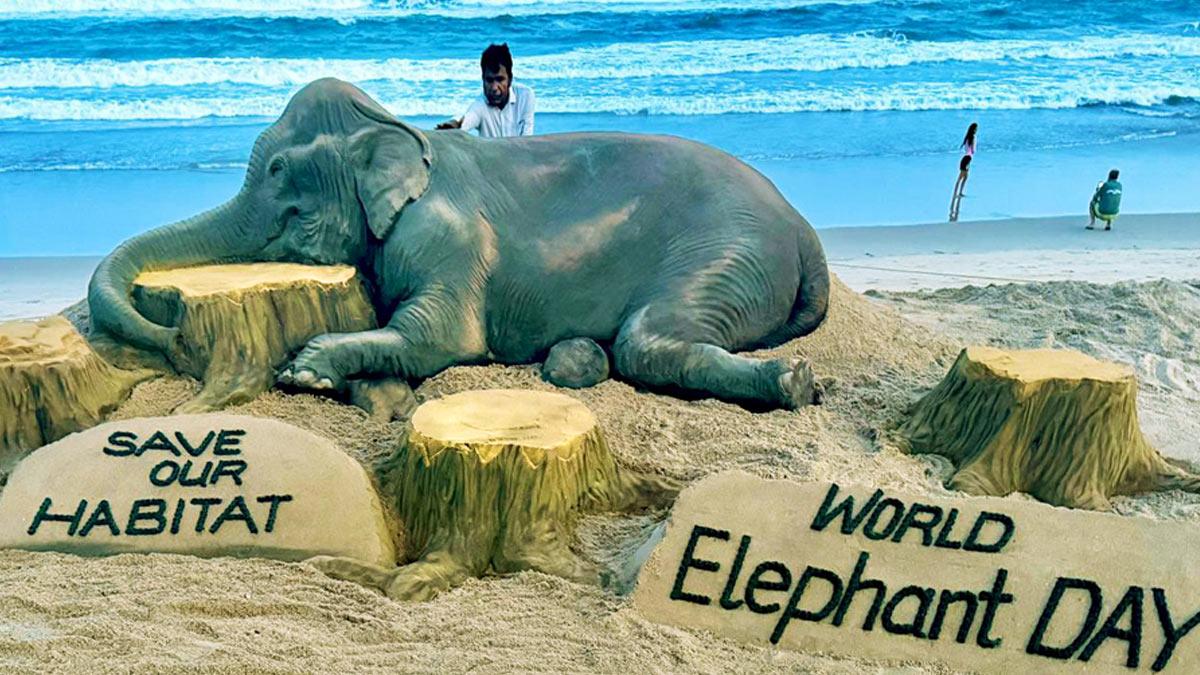 IMAGE: Sand artist Sudarsan Pattnaik creates a sand sculpture of an elephant in Puri with the message 'Save My Habitat' to raise awareness about elephant conservation on World Elephant Day. Photograph: @sudarsansand X/ANI Photo