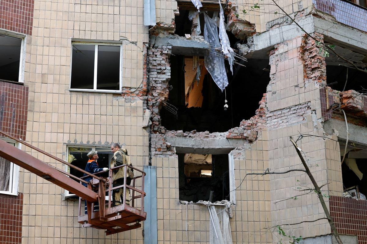 IMAGE: Workers remove debris in a block of flats damaged by overnight shelling, which local Russian-installed authorities called a Ukrainian military strike, in the course of the Russia-Ukraine military conflict, in Donetsk, a Russian-controlled city of Ukraine. Photograph: Alexander Ermochenko/Reuters
