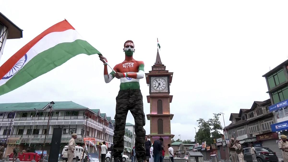 IMAGE: A man body painted in the Tricolour hoists the national flag at Lal Chowk in Srinagar. Photograph: ANI Video Grab