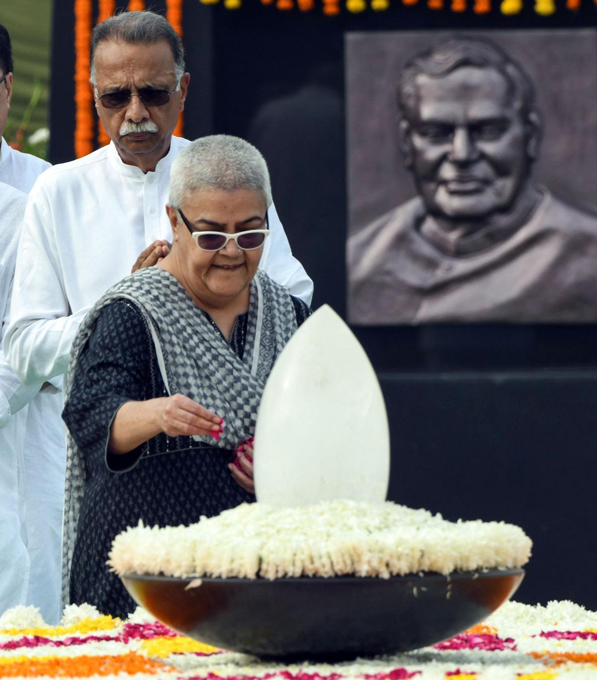 IMAGE: Namita Bhattacharya pays tributes to her father Atal Bihari Vajpayee on his death anniversary at Sadaiv Atal in New Delhi. Photograph: Jitender Gupta/ANI Photo