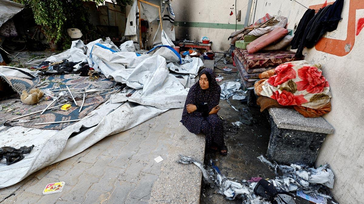 IMAGE: A Palestinian woman sits at the site of an Israeli strike on a school that was sheltering displaced people in Gaza City. Photograph: Mahmoud Issa/Reuters