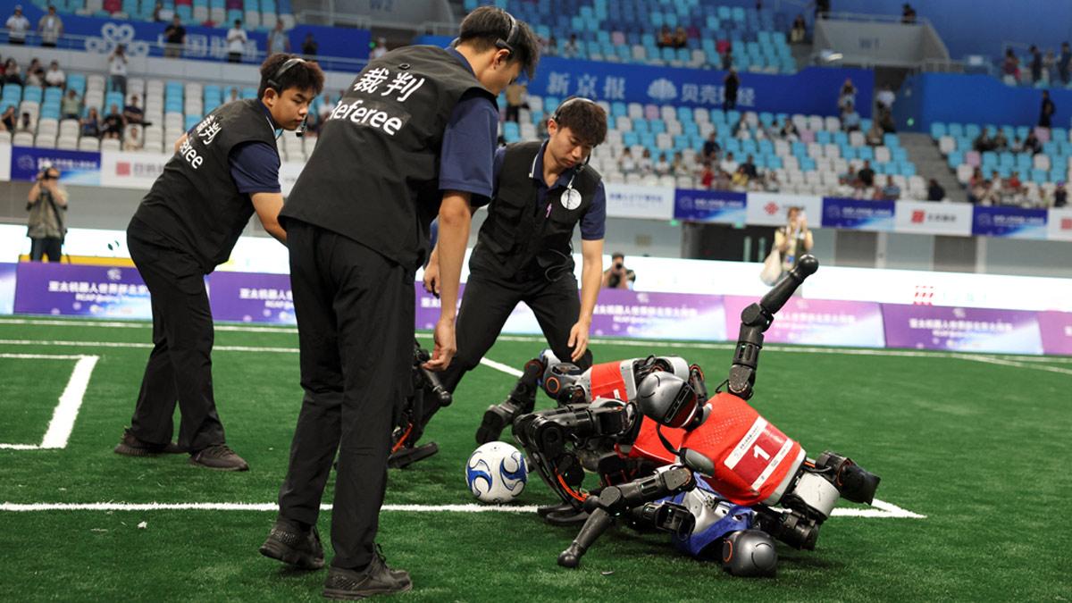 IMAGE: Referees approach Booster Robotics T1 humanoid robots that clashed during a 5-on-5 soccer group match on a football pitch at the inaugural World Humanoid Robot Games at the National Speed Skating Oval in Beijing. Photograph: Florence Lo/Reuters