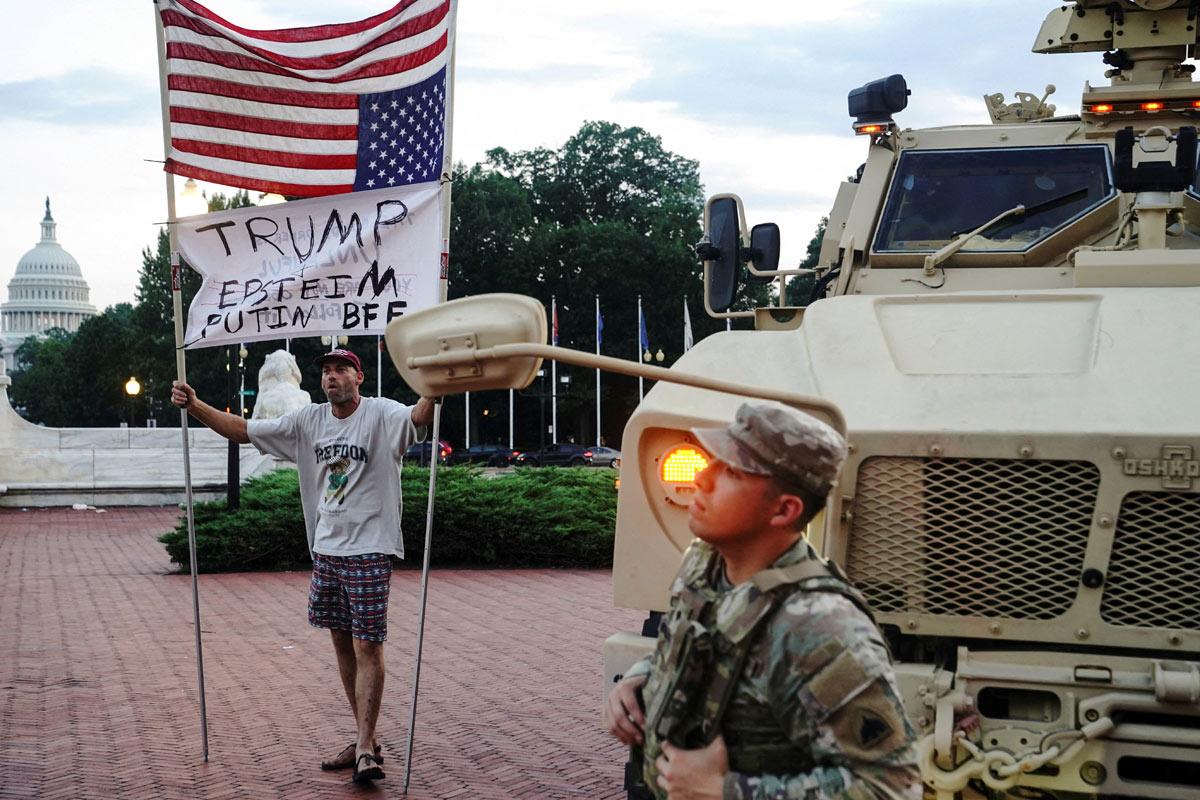 IMAGE: A demonstrator holds a banner and an upside-down American flag during a protest against Trump near a military vehicle at Union Station Washington, DC, after Trump's announcement of the federal takeover of the metropolitan police department and the deployment of the national guard to assist in crime prevention in the nation's capital. Photograph: Nathan Howard/Reuters