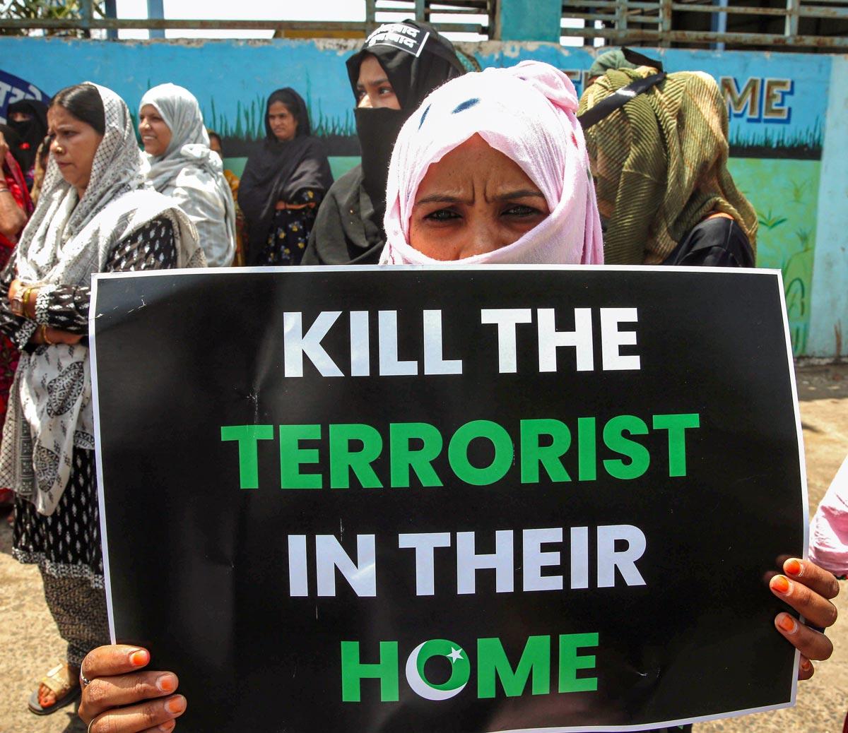 IMAGE: A woman holds a placard during a protest against the Pahalgam terror attack, in Bhopal. Photograph: ANI Photo