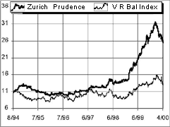 Zurich India Prudence has given an annualised return of 17.47 per cent since inception. During the rising markets of calendar 1999, it gained 105 per cent and in the past year ending April 2000, it rose 58 per cent. Today, the fund continues to have a diversified equity portfolio with 60 per cent allocation to equity with automobiles and consumer durables and non-durables accounting for 11 per cent and 13 per cent respectively. The information technology sector accounts for 8 per cent and the construction sector is 7 per cent. The fund has modest holdings in agriculture and food products, pharma and media.