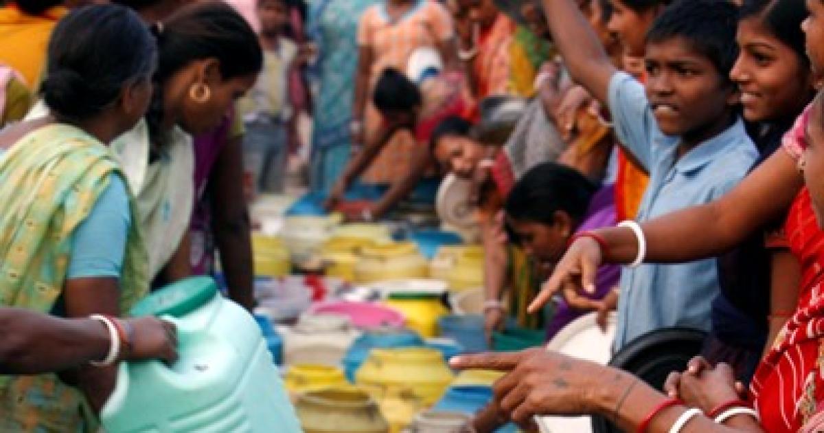 Image: Residents of a slum stand with empty water containers as they wait to collect drinking water from a tanker at a roadside in Kolkata. Photograph: Parth Sanyal/Reuters