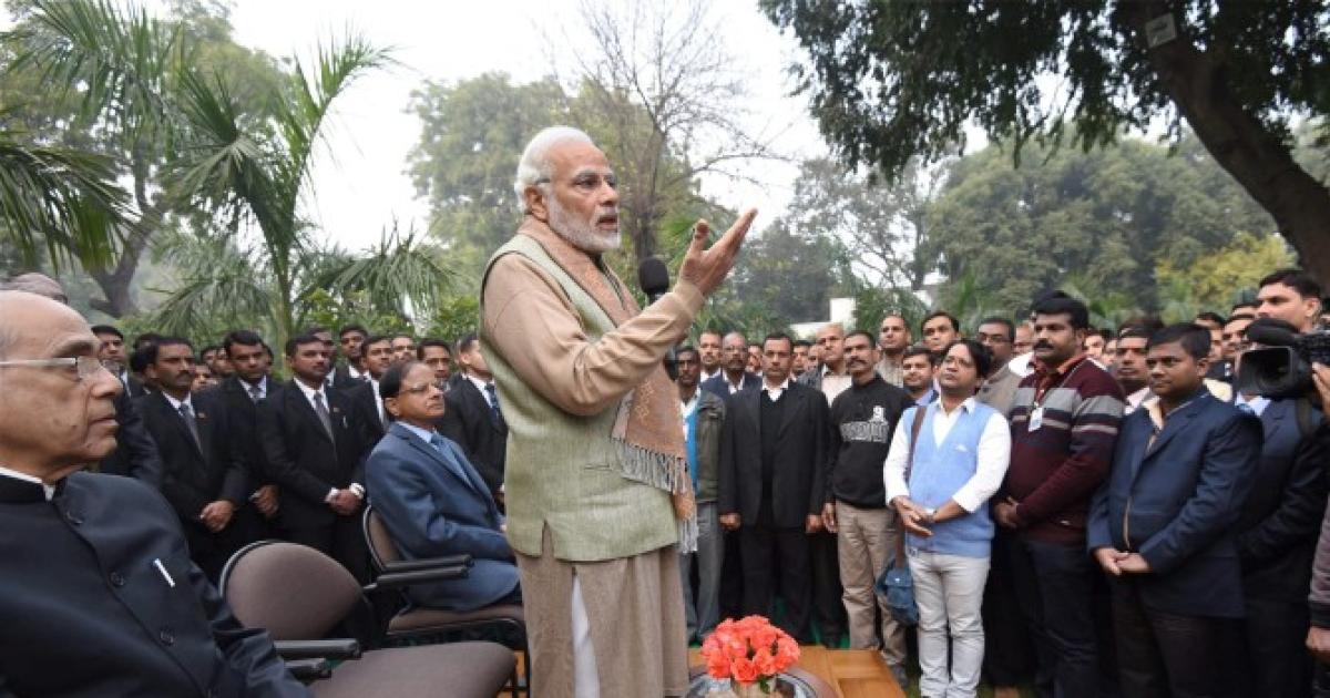 IMAGE: Prime Minister Narendra D Modi exchanges new year greetings with PMO officials and SPG personnel at 7, Lok Kalyan Marg, New Delhi, January 2, 2018. Photograph: PTI Photo