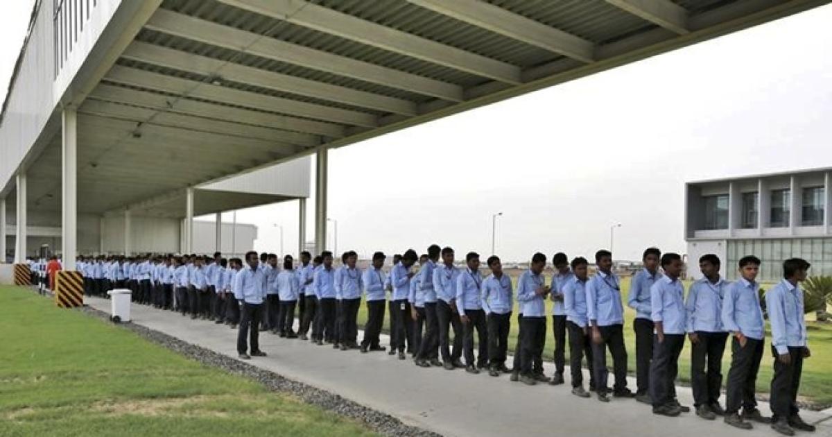 Image: Workers stand in a queue as they wait to enter the Ford Motor's new plant during its launch at Sanand in Gujarat. Photograph: Amit Dave/Reuters
