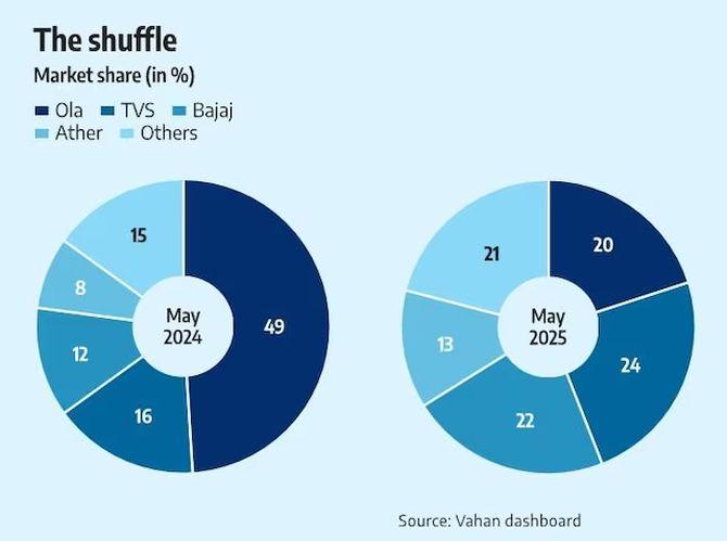 This pushed Ola Electric to third position behind TVS Motor (24 per cent) and Bajaj Auto (22 per cent), which have expanded their market presence.