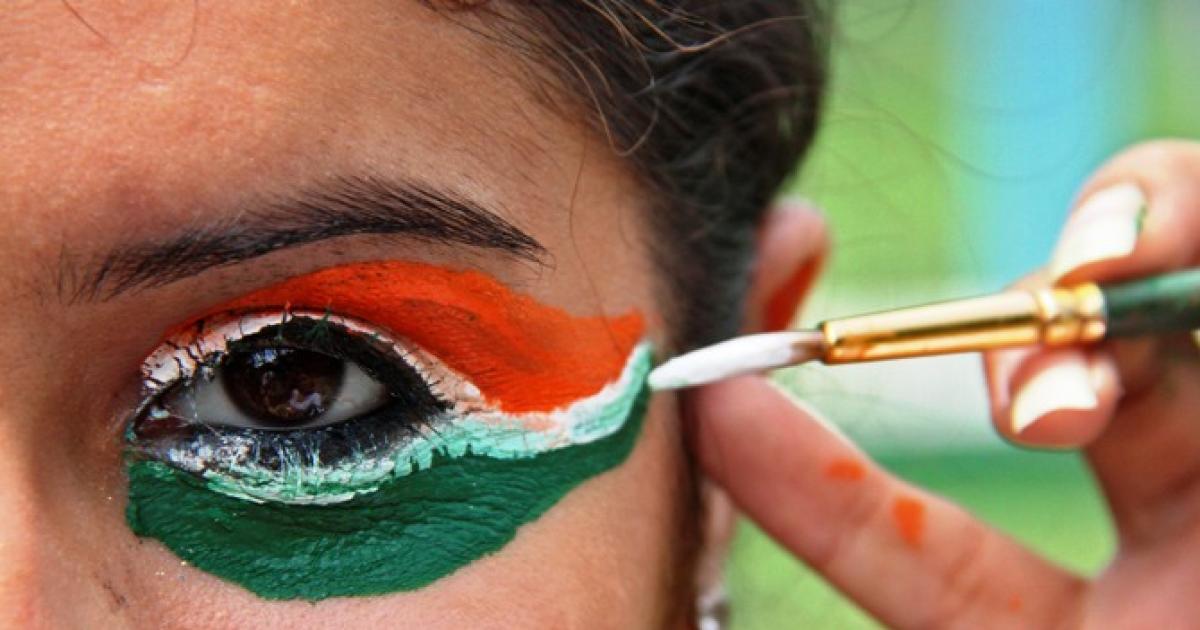 Image: A college girl gets her eye painted in tri-colours of India's national flag. Photograph: Ajay Verma/Reuters