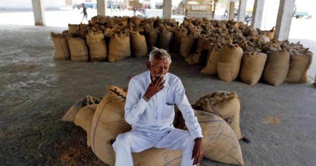 Image: A farmer smokes while sitting on sacks of paddy crops as he waits for customers, one week after the Indian government withdrew the circulation of high denomination banknotes, in Sanand village on the outskirts of Ahmedabad. Photograph: Amit Dave/Reuters
