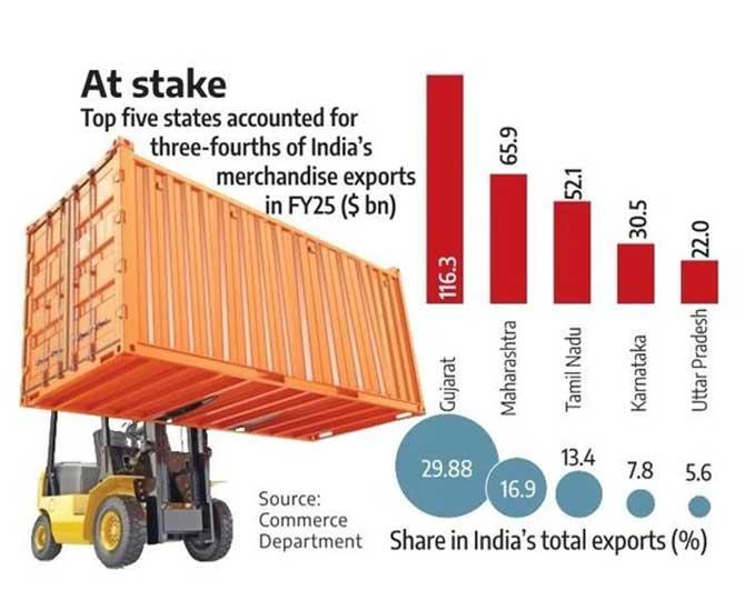 The top five exporting states -- Gujarat, Maharashtra, Tamil Nadu, Karnataka, and Uttar Pradesh -- together accounted for around three-fourths of India's total merchandise exports of $437 billion in FY25.