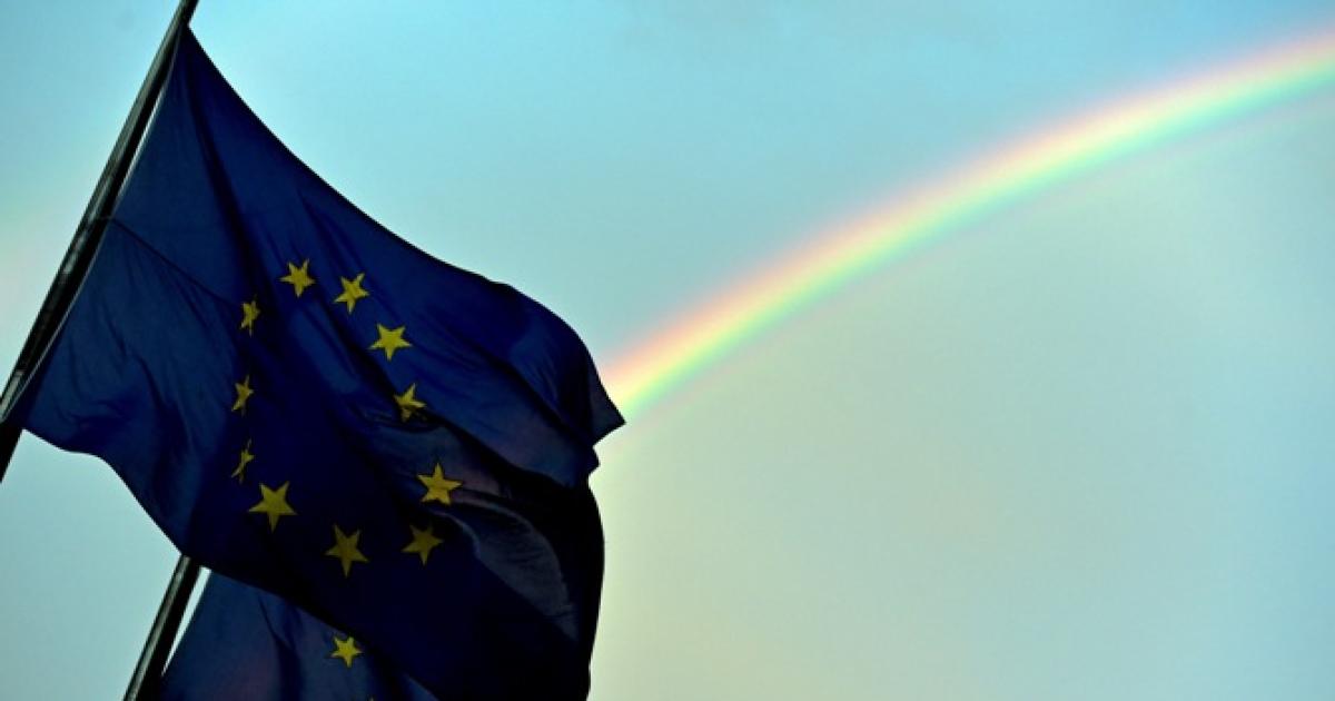 Image: A rainbow is seen behind European flags during a euro zone EU leaders emergency summit on the situation in Greece at the European Council headquarters in Brussels, Belgium, July 7, 2015. Photograph: Eric Vidal/Reuters