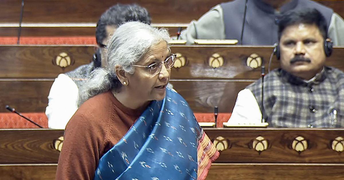 IMAGE: Finance Minister Nirmala Sitharaman speaks in the Rajya Sabha during the Budget session of Parliament, January 31, 2025. Photograph: Sansad TV/ANI Photo