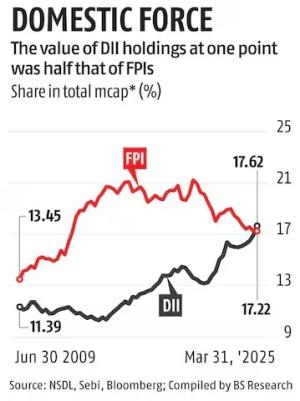 According to Prime Database, DIIs held a 17.62 per cent stake in companies listed on the National Stock Exchange, edging out FPIs at 17.22 per cent, as of March 2025.