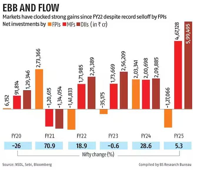 During FY25, overseas funds pulled out nearly ₹1.3 trillion. Despite that, the benchmark Nifty managed to eke out a gain of over 5 per cent.