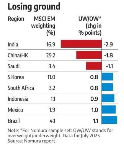According to an analysis done by Nomura of 45 large EM funds, relative allocations to India fell by 110 basis points (bps) month-on-month (M-o-M) in July, with as many as 41 funds reducing exposure.