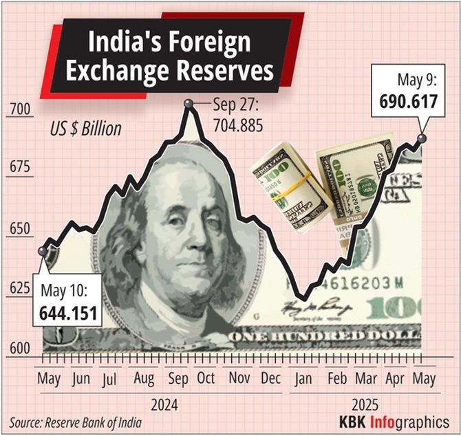 India's forex reserves jumped by $4.55 billion to $690.62 billion for the week ended May 9 on the back of a steep increase in gold assets, the RBI said on Friday.