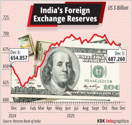 India's forex reserves jumped by $1 billion to $687 billion during the week ended December 5, the RBI said on Friday.