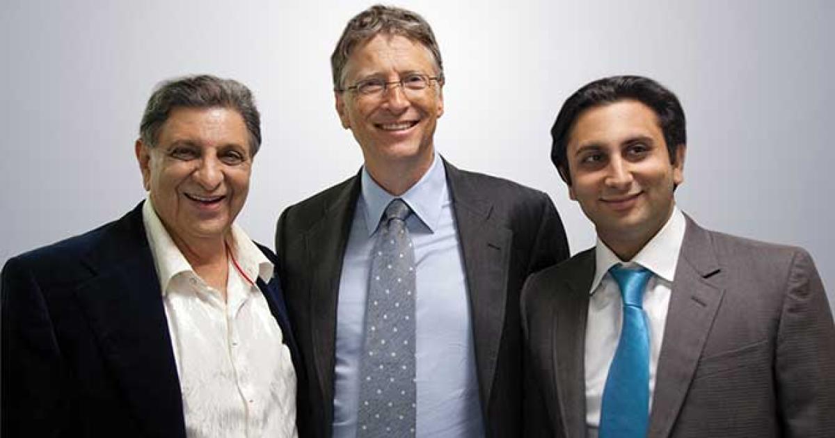 IMAGE: From left Dr Cyrus S Poonawalla, founder, Serum Institute of India, Bill Gates and Adar C Poonawalla, CEO, Serum Institute, aat the Serum Institute of India offices in Pune.