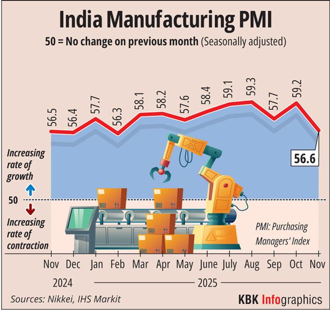 The seasonally adjusted HSBC India Manufacturing Purchasing Managers' Index (PMI) falling to 56.6 in November from 59.2 in October, highlighted the slowest improvement in operating conditions since February.