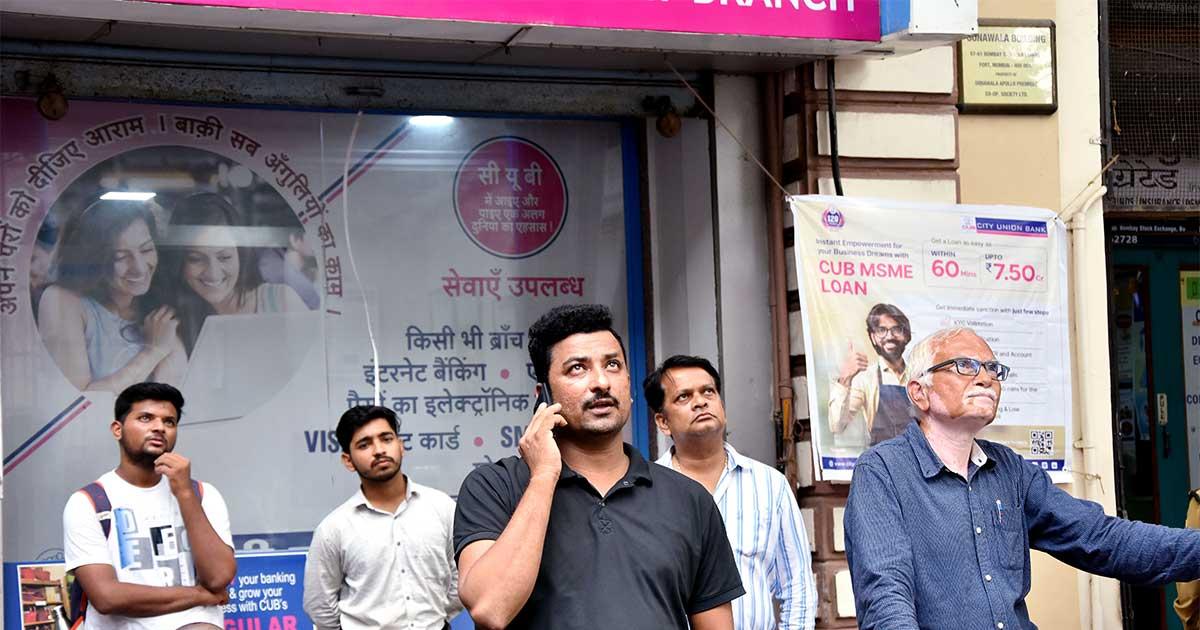 IMAGE: People watch the live stock market on a display screen outside the Bombay Stock Exchange. Photograph: ANI Photo