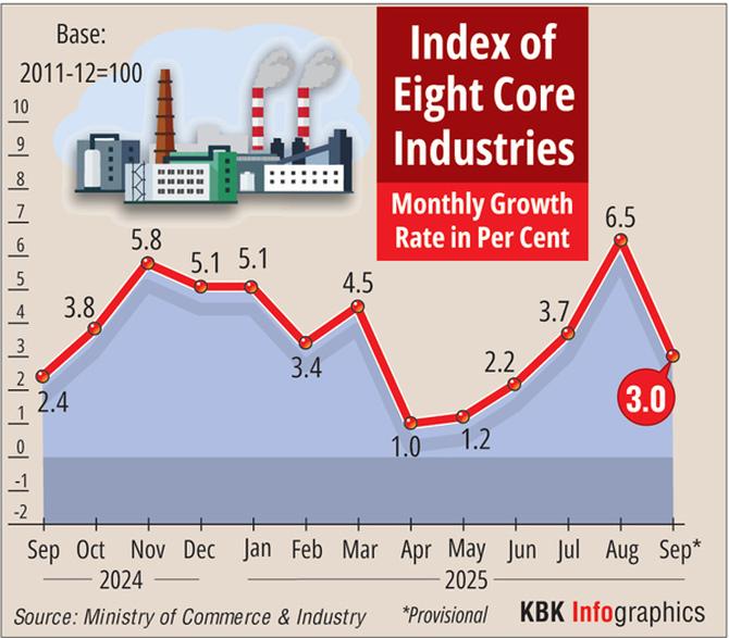 India's eight key infrastructure sectors' output stood at 3 per cent in September, slower than the 6.5 per cent expansion recorded in August, according to official data released on Tuesday.