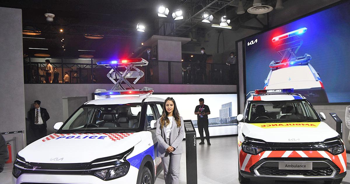 IMAGE: The KIA police car at the Auto Expo 2023 in Greater Noida. All photographs: Amit Sharma/ANI Photo