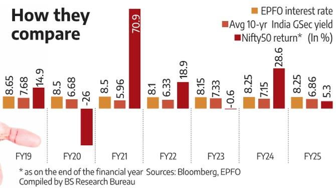 For FY25, EPFO declared an interest rate of 8.25 per cent on members’ EPF balances, while the average yield on 10-year government securities was 6.86 per cent.