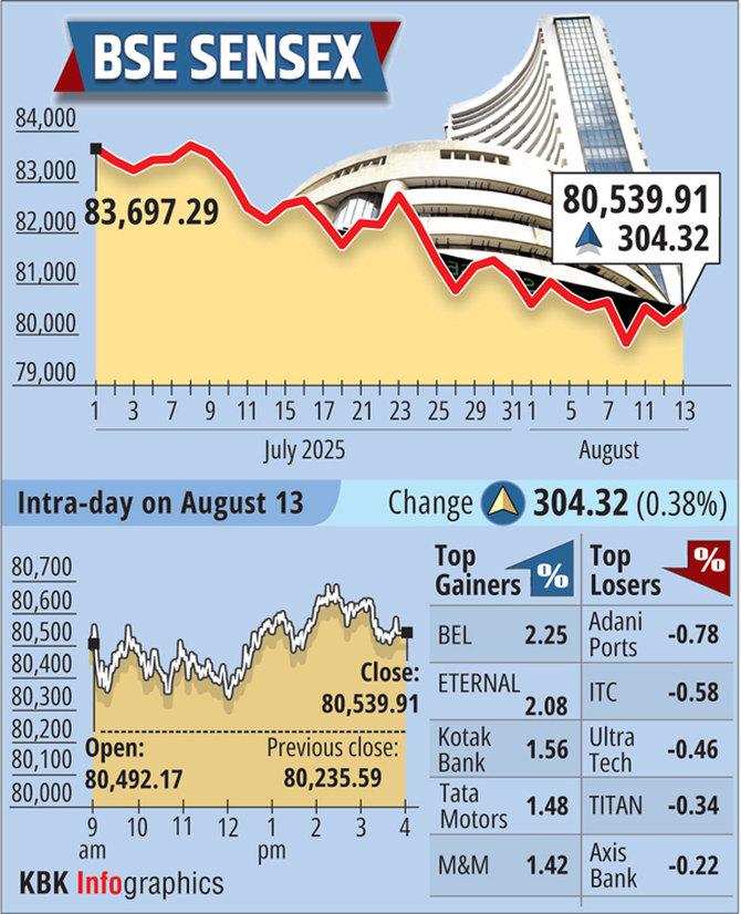 The 30-share BSE Sensex climbed 304.32 points or 0.38 per cent to settle at 80,539.91.