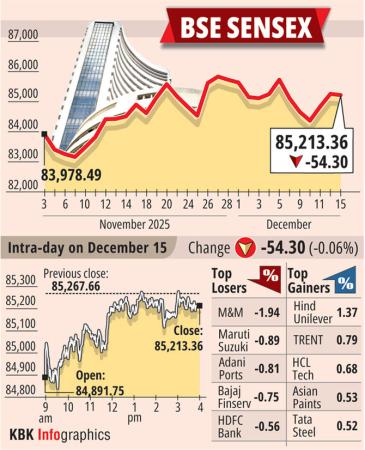 The 30-share BSE Sensex dipped 54.30 points, or 0.06 per cent, to at 85,213.36.