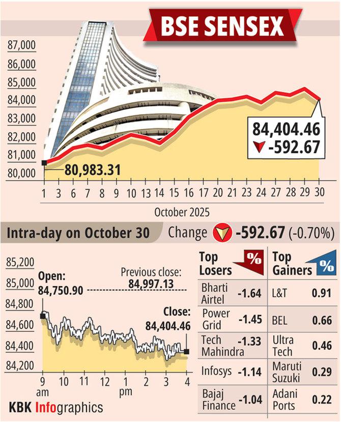 The 30-share BSE Sensex tanked 592.67 points or 0.70 per cent to settle at 84,404.46.